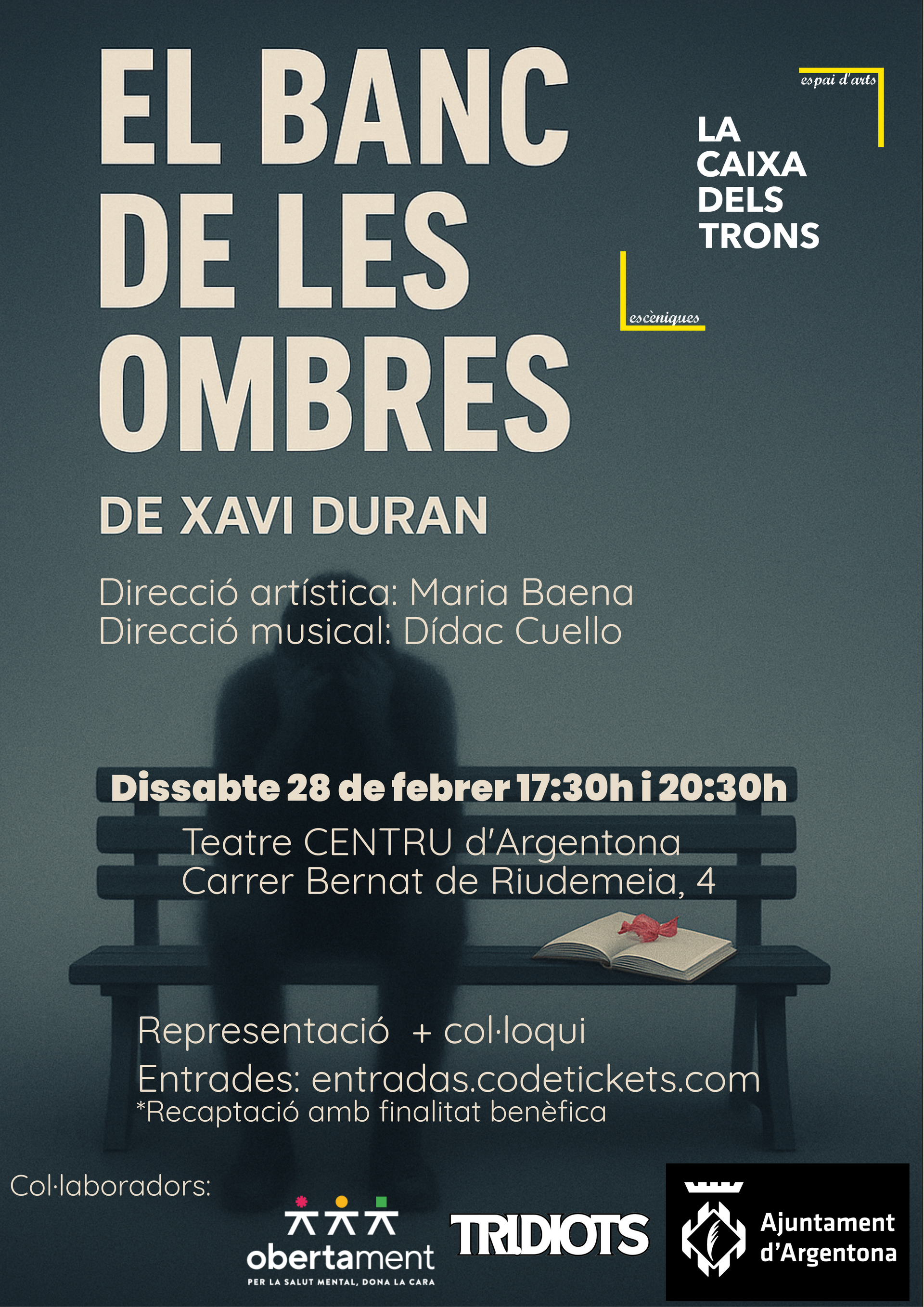 SINOPSI: «El Banc de les Ombres» és una obra de teatre contemporània que ens transporta a un centre psiquiàtric on personatges diversos conviuen amb els seus trastorns mentals. A través de situacions reals, converses carregades d’humor, tendresa i cruesa, i una dramatúrgia valenta i humana, l’espectador s’endinsa en els mons interns de persones amb esquizofrènia, trastorn bipolar i paranoia. L’obra no defuig el patiment, però posa la llum en les relacions, l’empatia i la possibilitat de millora.